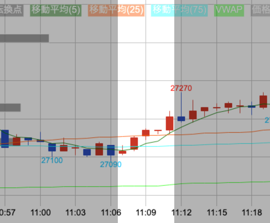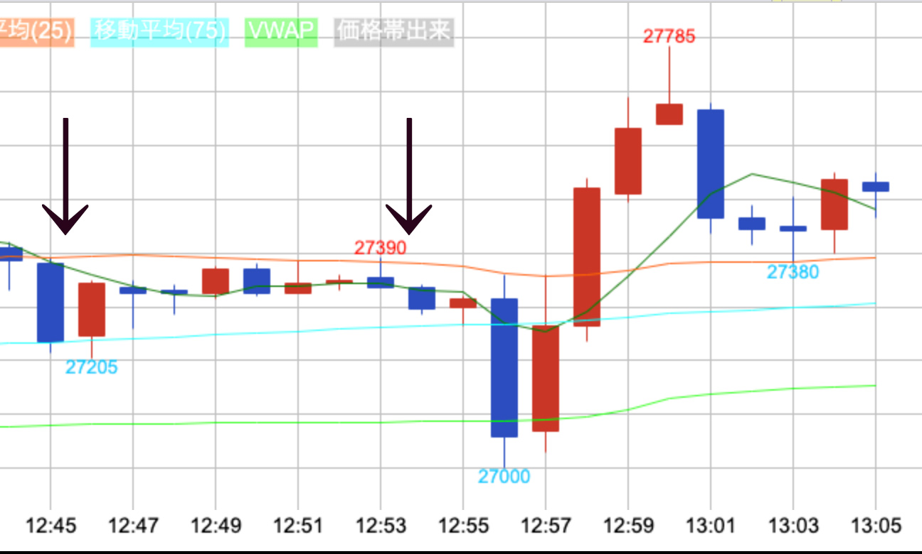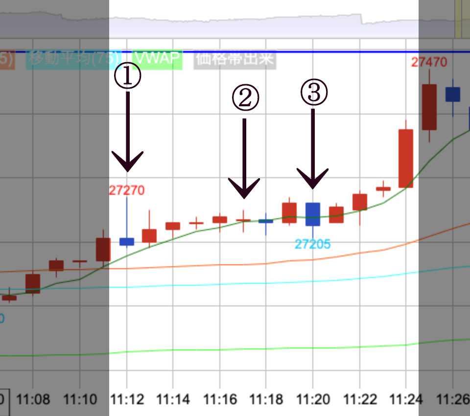 値動きが早すぎ&大きすぎて🔰が入ったら確実にやられる!と思いながらも一瞬の値動きで7ティック✕3株ゲット。
