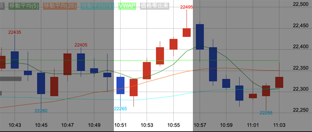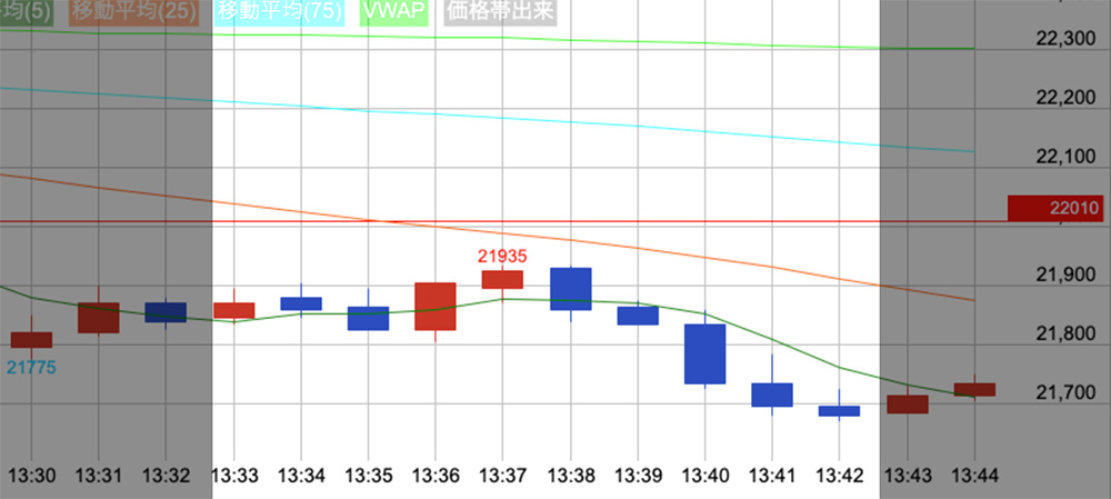 ずーっと下がり続け、この日一番の底かと思って13:30〜13:31と陽線が出たので反発を狙い21850(13:33)でIN→13:35に下げきらず反発したのでこれは上がるはず!と21835(13:39)でさらにINの計5株。自分の中ではナンピンではなくここを押し目に上がると思ったらさらに下がる→13:42底で売る。
