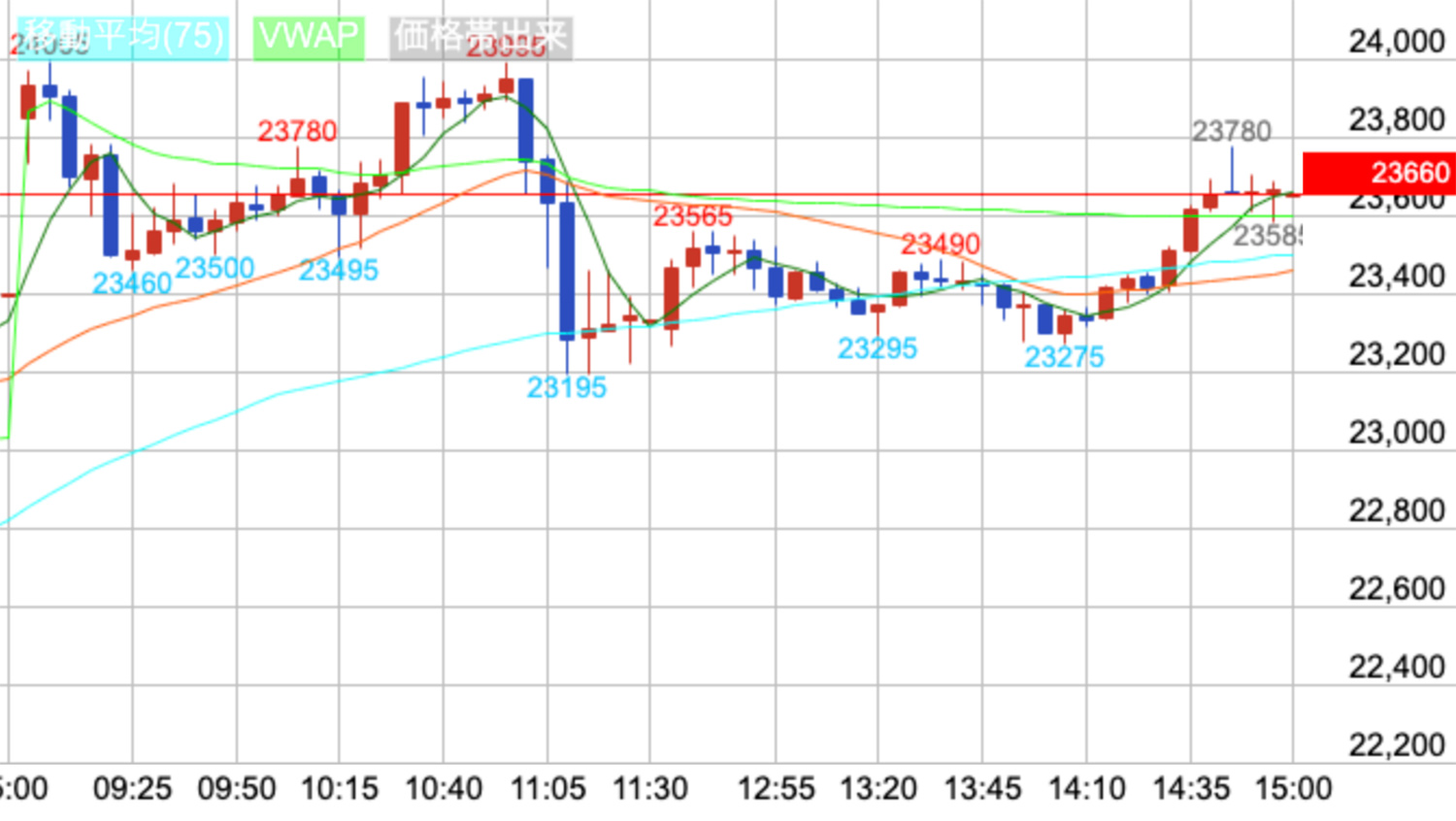 朝一は値動きが激しいので入らないという自分ルールは守れて9時半過ぎからのトレード。今日は上げ相場と判断し、(買)で入りました。前半は順調にプラスを重ねるも、突然の陽線(陰線)や上下髭には相変わらずついていけません。