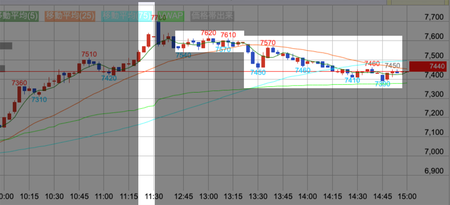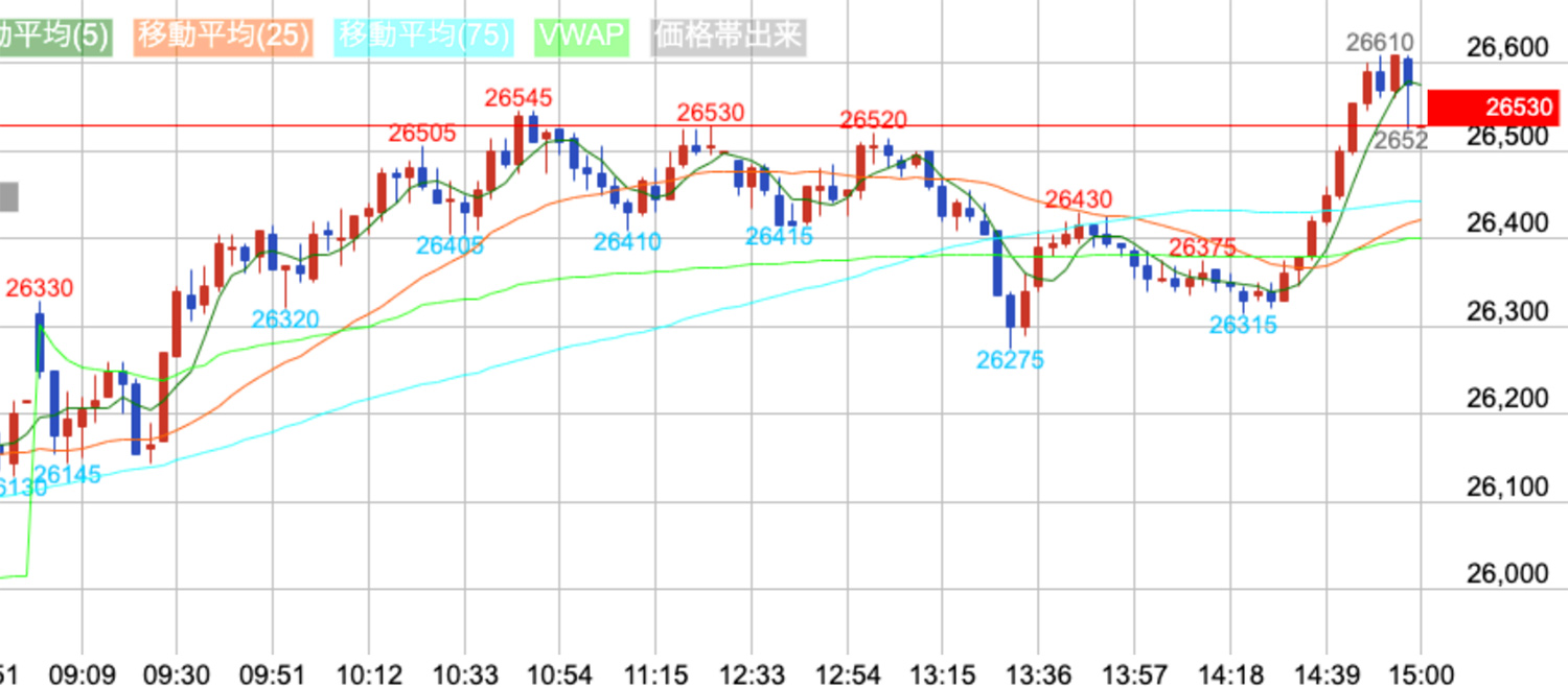 最初のうちは良かったんです。引け直近の上昇に乗れて+¥2000。この時点で前場のレバ練のマイナスは取り返していました。調子に乗って続けたら下髭に捕まって自動損切り発動-¥3000&-¥4000で結局マイナス😢前場→後場は持ち越してはいけないと有識者が言っていたので、前場は店終い。