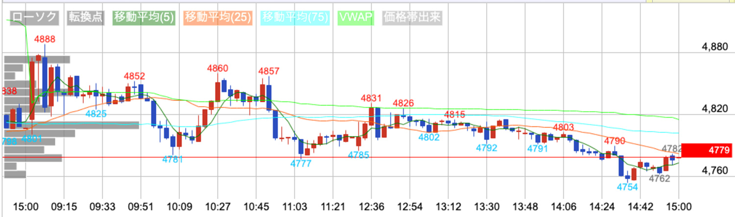 後場は緩やかな下げトレンドだったので最後も下がると思って大引けに向けてショートで待機してたら急上昇。ここでもまた¥30近い幅でやられてしまったので、それさえなければ勝てていました。